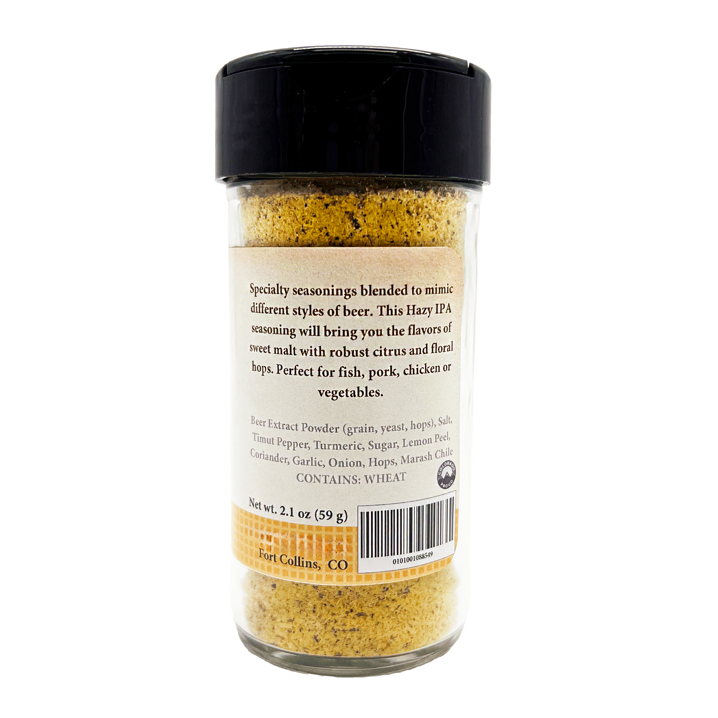 Ingredients: Beer Extract Powder (grain, yeast, hops), Salt, Timut Pepper, Turmeric, Sugar, Lemon Peel, Coriander, Garlic, Onion, Hops, Marash Chile Contains: Wheat
