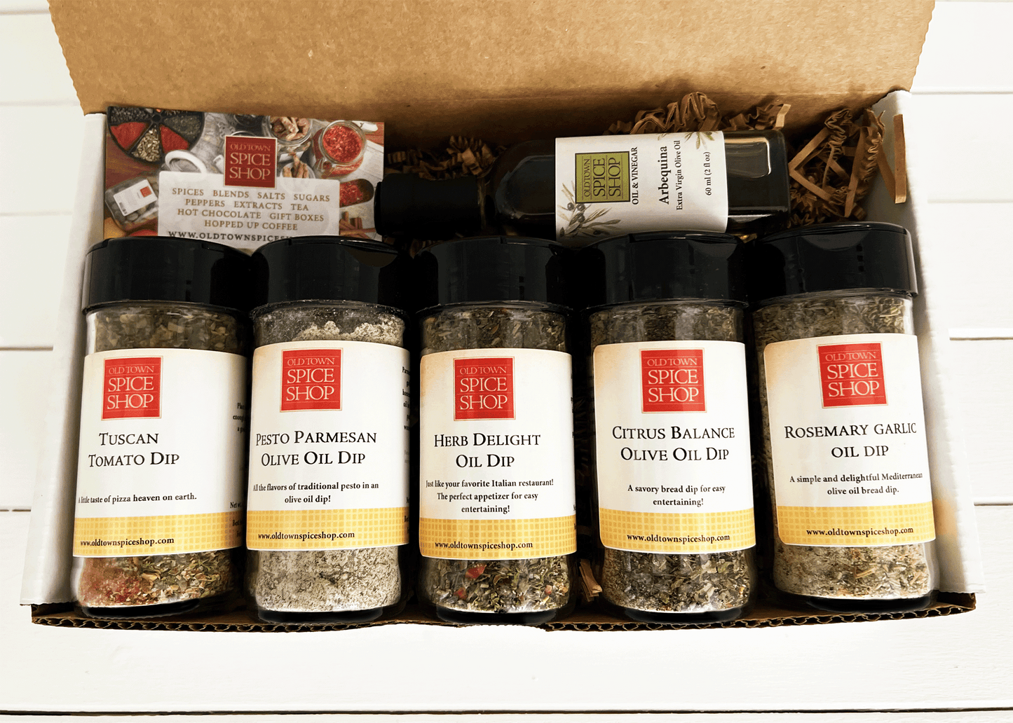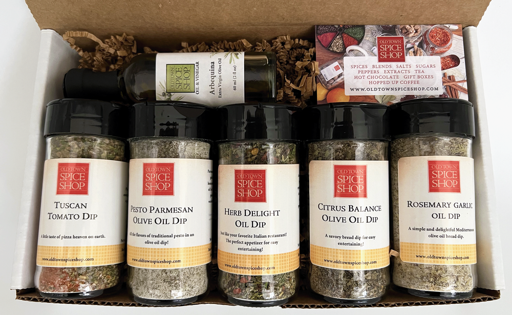 2 oz Jar Pesto Parmesan Olive Oil Dip, 1.6 oz Jar Citrus Balance Oil Dip, 2 oz Jar Tuscan Tomato Oil Dip, 1. oz Jar Herb Delight Oil Dip, 2.2 oz Jar Rosemary Garlic Oil Dip, 2 oz Bottle Arbequina Extra Virgin Olive Oil