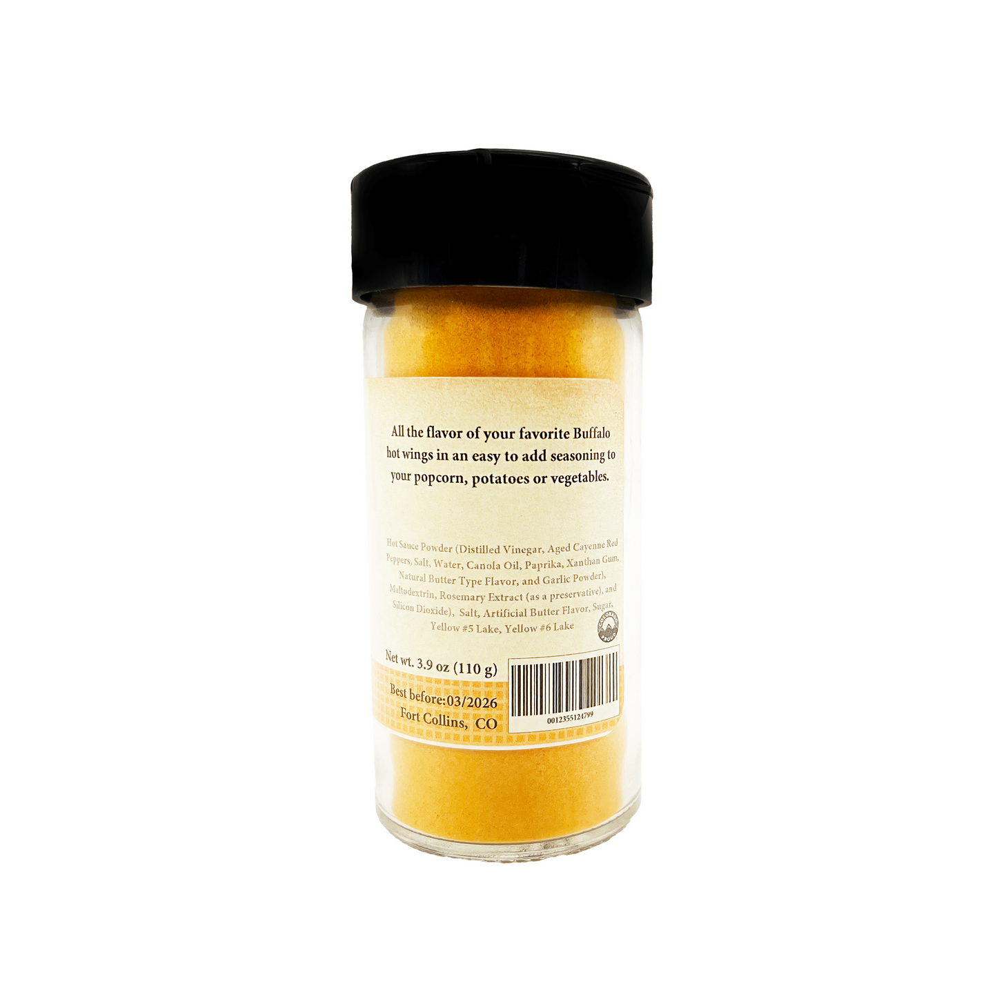 Ingredients: Hot Sauce Powder (Distilled Vinegar, Aged Cayenne Red Peppers, Salt, Water, Canola Oil, Paprika, Xanthan Gum, Natural Butter Type Flavor, and Garlic Powder), Maltodextrin, Rosemary Extract (as a preservative), and Silicon Dioxide), Salt, Artificial Butter Flavor, Sugar, Yellow #5 Lake, Yellow #6 Lake