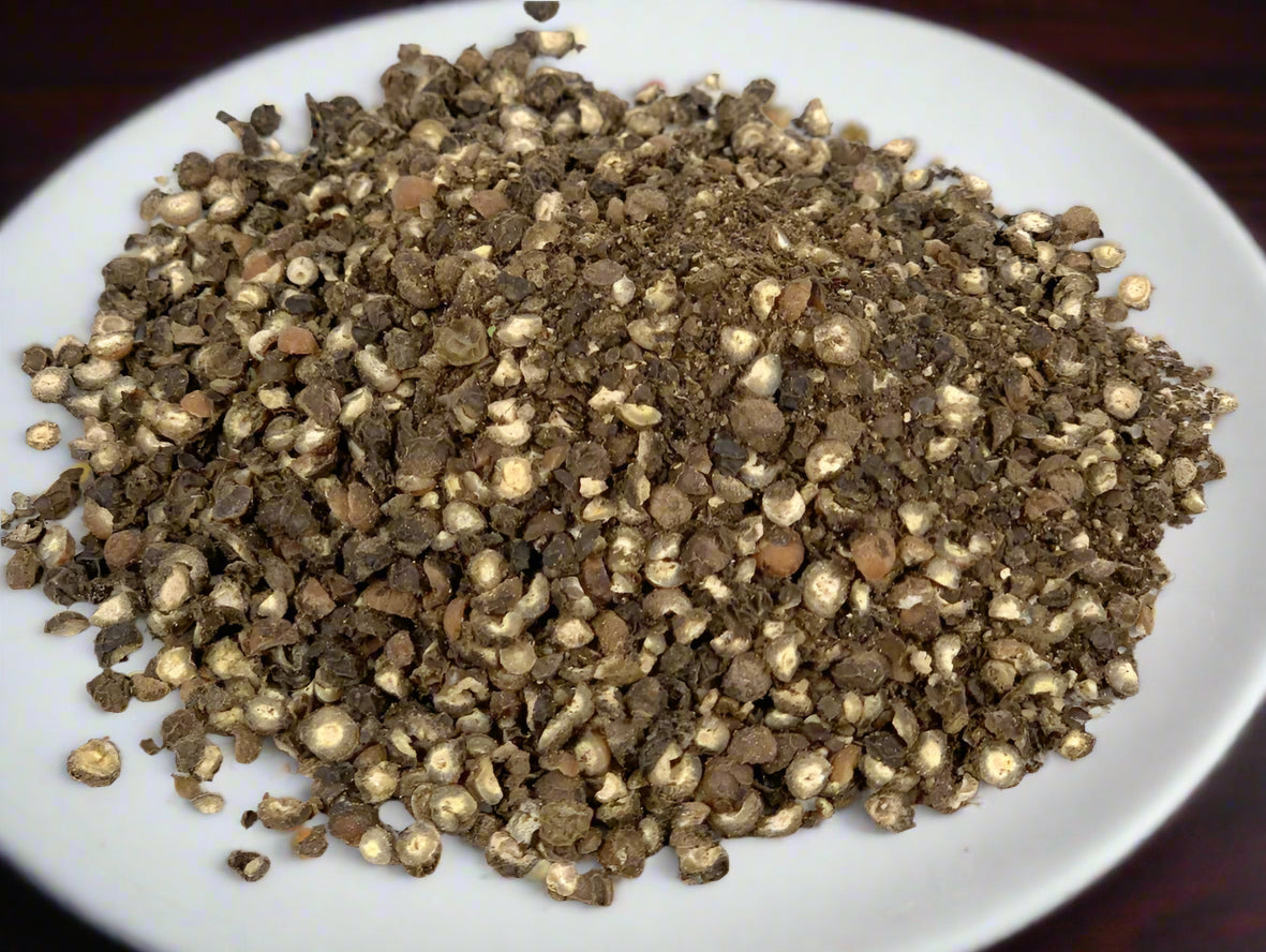 Les grains de poivre noir sont des grains de poivre vert fermentés et séchés. Ils ont une saveur croquante et aromatique. Les grains de poivre noir ont la saveur la plus robuste de tous les grains de poivre. Le poivre noir coupé en boucherie est une mouture grossière, presque concassée. Parfait pour un steak en croûte de poivre ou partout où vous avez besoin d'une bouchée plus forte !