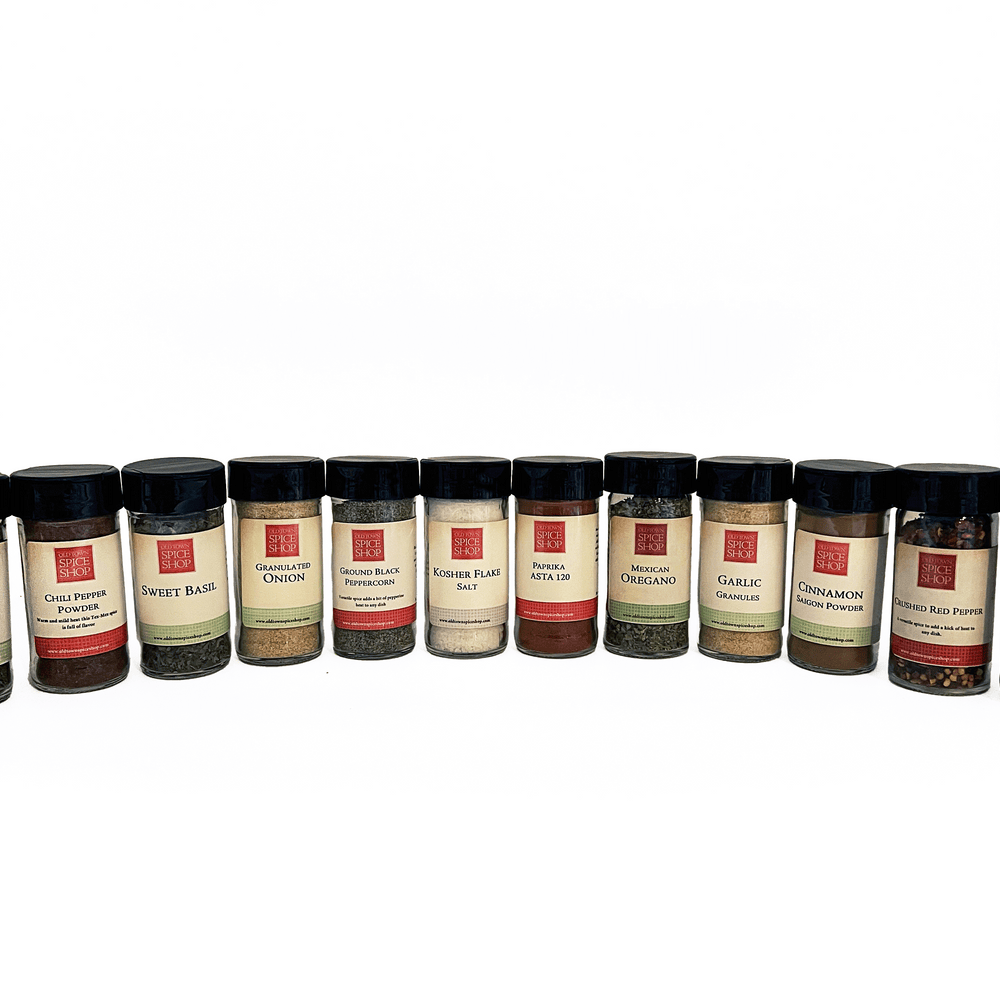 2,5 oz de granulés d'ail en pot, 1,5 oz de poudre de cannelle de Saigon en pot, 1,7 oz de cumin moulu en pot, 0,6 oz de basilic doux (domestique) en pot, 3,7 oz de sel en flocons casher en pot, 1,8 oz de poivre noir moulu en pot, 2 oz de poudre de piment en pot, Pot de 0,3 oz de flocons de persil, pot de 1,2 oz de poivron rouge broyé, pot de 2,3 oz de granulés d'oignon, pot de 0,5 oz d'origan mexicain, pot de 1,8 oz de paprika 120 ASTA