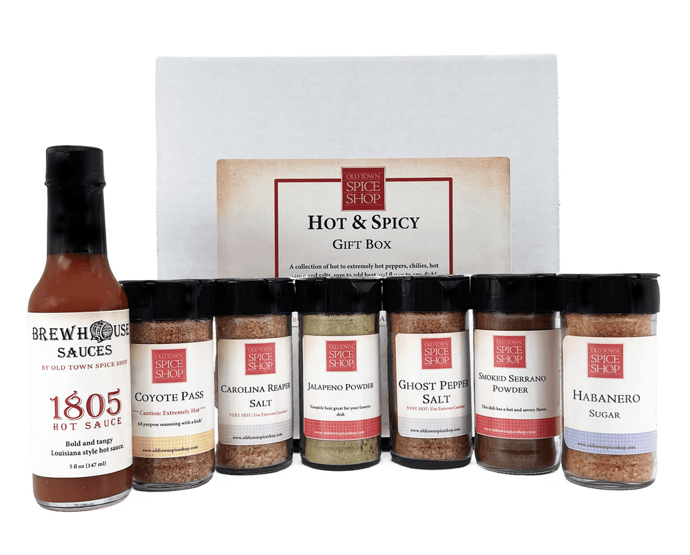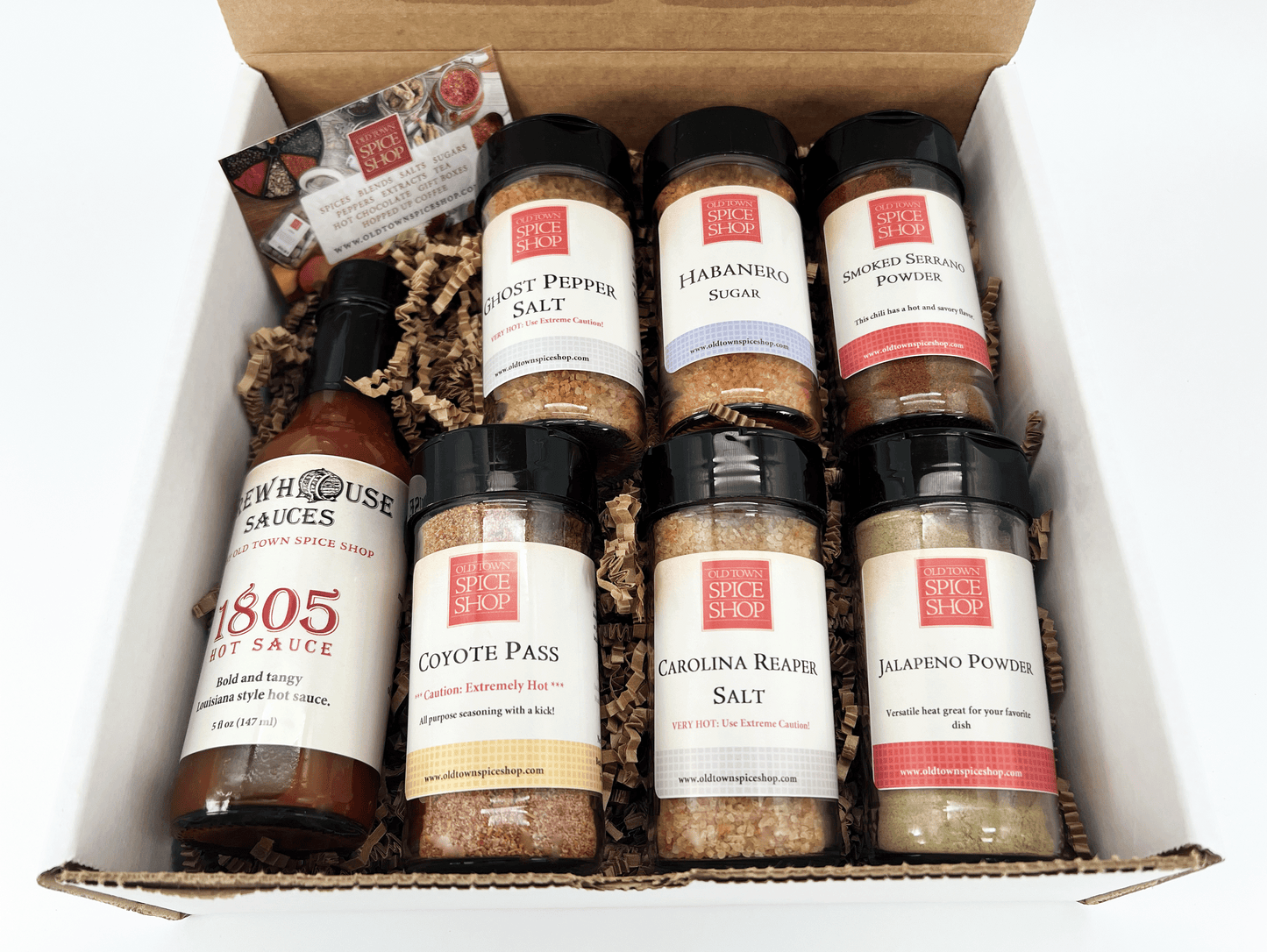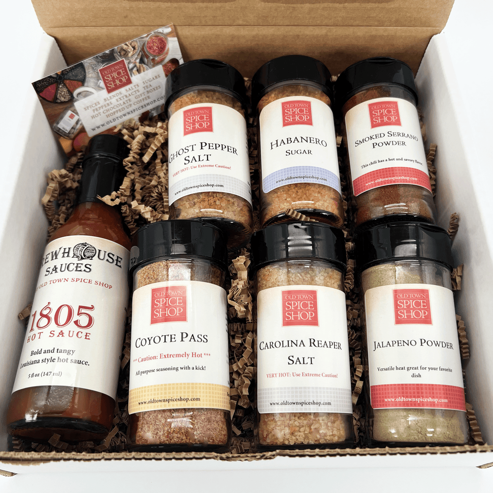 Pot de 3,6 oz de sel de poivre fantôme, pot de 1,9 oz de poivre d'oiseau d'Afrique, pot de 2,5 oz de sucre Habanero, pot de 3 oz de Coyote Pass, pot de 2,1 oz de poudre de Jalapeno, pot de 2 oz de poudre de Serrano fumée, pot de 2,2 oz de sel Carolina Reaper, pot de 2 oz d'Aji Poudre d'Amarillo