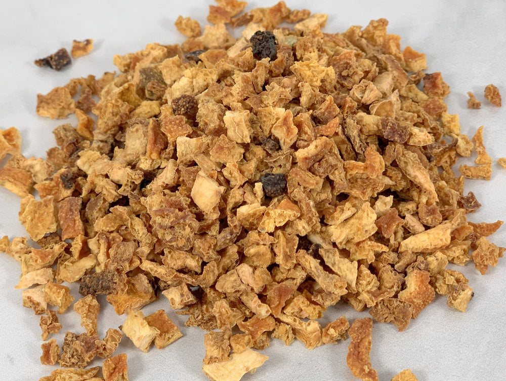 To re-hydrate add three parts water to one part peel and let stand for about 15 minutes. When using in its dehydrated form use 1/3 of the amount of fresh orange peel that the recipe calls for. Orange Zest is used in baking recipes and recipes such as marinades, vegetables, chicken, dressings, beer, seafood and rice.